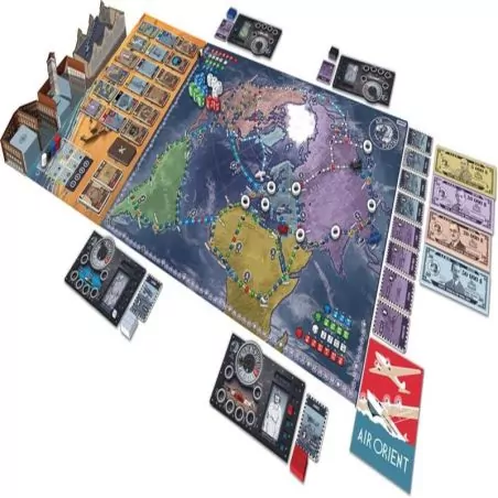 Contenu de la boite : 1 plateau recto-verso 1 plateau opérations 13 dés météo plus de 270 cartes (Ville, Objectif, Cargo, etc.) 30 pions 100 billets une règle de jeu