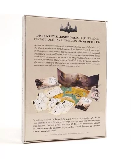 - un livret de 96 pages contenant les règles du jeu, vous permettant de créer vos personnages ainsi que deux scenarios originaux pour découvrir l’univers d’Aria