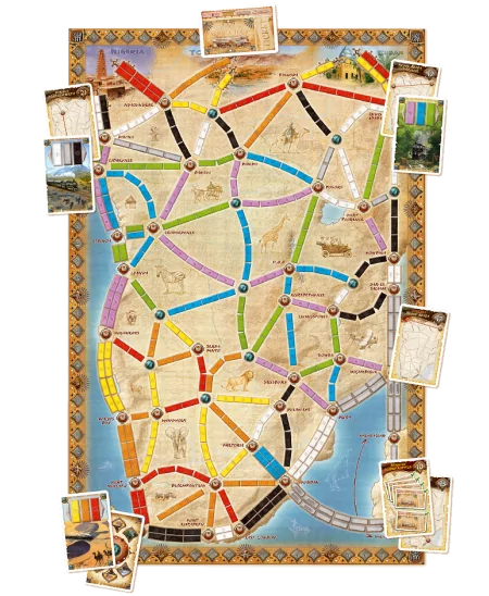 Dans « Les Aventuriers du Rail – Au Coeur de l’Afrique » Partez à la conquête du rail en Afrique et tentez de prendre le contrôle du réseau ferroviaire en reliant un maximum de villes entre elles.