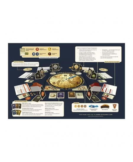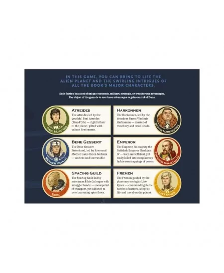 Bienvenue dans le célèbre jeu de plateau vieux de 40 ans qui vous permet de recréer l’univers incroyable de DUNE de Frank Herbert. Dans DUNE, vous deviendrez le leader d’une des six grandes factions. Chacun souhaite contrôler la ressource la plus précieuse de l’univers – le Mélange, l’épice mystérieuse que l’on ne trouve qu’à grands frais sur la planète DUNE. Comme le dit le duc Leto Atreides : « Tout s’estompe avant le Mélange. Une poignée d’épices achètera une maison sur Tupile. Il ne peut pas être fabriqué, il doit être exploité sur Arrakis. C’est unique et il a de vraies propriétés gériatriques. » Et sans Mélange, les voyages dans l’espace seraient impossibles. Ce n’est qu’en ingérant la drogue qui crée une dépendance que la Guilde peut continuer à avoir des visions de l’avenir, ce qui lui permettra de tracer un chemin sûr à travers l’hyperespace.