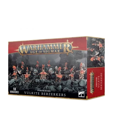 Vous trouverez dans ce kit plastique, toutes les pièces nécessaires pour assembler 10 Vulkite Berzerkers, des guerriers Fyreslayers forts et résolus. Ils sont fournis avec une gamme d’armes impressionnante: haches et pics de pyracier, boucliers lamés de jet, et ils sont couverts de runes d’ur-or martelées à même la peau.
