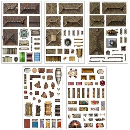 Ces motifs autocollants statiques fonctionneront sur n’importe quelle carte RPG pour ajouter instantanément des maisons, tables, cruches et bien d’autres détails !