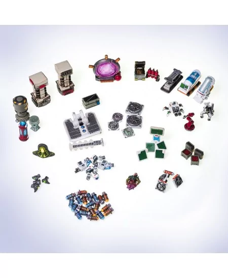 La boite contient un set de décors en plastique spécialement conçu pour l’univers des jeux futuristes. Le tout, monter et à peindre.
