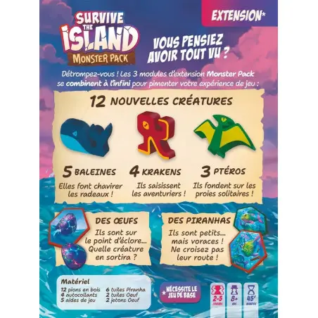 Dans cette version « Monster Pack » Désormais des baleines risquent de faire chavirer les radeaux, des krakens saisissent les aventuriers pour les entrainer vers le fond, et des ptérodactyles fondent sur les proies solitaires pour les emporter ! Des œufs sont également disposés dans l’île, quelle créature en sortira ? Quand aux piranhas qui hantent les rivières, autant ne pas croiser leur route.